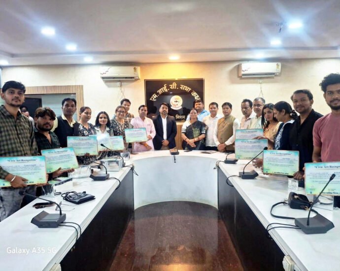 कोरबा छत्तीसगढ़ कोरबा 20 फरवरी 2026 -नगर पालिक निगम कोरबा के सिटी ब्यूटीफिकेशन अंतर्गत संचालित ’’ क्रिएटिव कार्नर ’’ के आर्टिस्टो, कलाकारों को गुरूवार को महापौर श्रीमती संजूदेवी राजपूत के द्वारा सम्मानित किया गया। आयुक्त श्री आशुतोष पाण्डेय एवं सभापति श्री नूतन सिंह ठाकुर,वरिष्ठ पार्षद नरेंद्र देवांगन ने भी इन