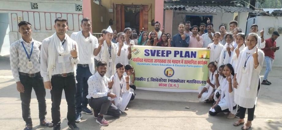 कोरबा /कलेक्टर एवं जिला निर्वाचन अधिकारी कोरबा के निर्देशानुसार एवं जिला स्वीप नोडल अधिकारी एवं सीईओ जिला पंचायत श्री विश्वदीप के समन्वय से विधानसभा निर्वाचन 2023 के दौरान शहरी एवं ग्रामीण क्षेत्रों के युवा, बुजुर्ग, महिला, पुरूष सहित स्कूल-कॉलेजों के सभी छात्र- छात्राओं को मतदान के प्रति जागरूक करने हेतु नुक्कड़-नाटक, रैली, नारा-लेखन, निबंध, भाषण, मेहंदी प्रतियोगिता, पोस्टर निर्माण जैसे अनेक कार्यक्रमों के माध्यम से शत-प्रतिशत मतदाताओं को जागरूक किया जा रहा है।
