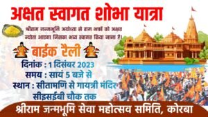 शुक्रवार को यह कार्यक्रम कोरबा नगर में होगा। शोभायात्रा के साथ दुपहिया और अन्य गाड़ियों में लोग होंगे। आकर्षक कलश में अक्षत होंगे, जिनका विभिन्न स्थानों पर पूजन और दर्शन होगा। सीतामणी चौराहा, सप्तदेव मंदिर, पुराना बस स्टैंड, रेलवे क्रासिंग पेट्रोल पंप, सुनालिया नहर पुल, ट्रांसपोर्ट नगर चौक इन सभी स्थानों पर पूजन, दर्शन व स्वागत किया जाएगा। सीएसईबी चौराहा स्थित गायत्री शक्तिपीठ पहुंचकर स्वागत शोभायात्रा का समापन होगा और यहां पर अक्षत पात्र को शक्तिपीठ में स्थापित किया जाएगा। श्रीराम जन्मभूमि सेवा महोत्स्व समिति कोरबा द्वारा शहरवासियों को इस कार्यक्रम में अधिक से अधिक संख्या में भाग लेने आग्रह किया गया है।