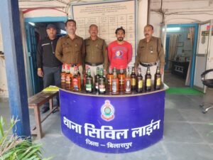 बिलासपुर:मामले का विवरण इस प्रकार है की दिनांक 17/12/2023 को थाना प्रभारी सिविल लाइन प्रदीप आर्य को जरिए मुखबिर सूचना मिला की ईमलीपारा रोड बजरंग बली मंदिर के पास एक व्यक्ति इलेक्ट्रानिक स्कूटी में शराब रखकर तस्करी कर रहा है की सूचना से श्रीमान पुलिस अधीक्षक महोदय श्री संतोष कुमार सिंह को अवगत कराया गया, जिनके द्वारा उक्त व्यक्ति को तत्काल गिरफ्तार कर कार्यवाही करने दिए गए निर्देश के पालन में अतिरिक्त पुलिस अधीक्षक महोदय शहर श्री राजेंद्र जयसवाल, नगर पुलिस अधीक्षक महोदय सिविल लाइन श्री संदीप पटेल के मार्गदर्शन में थाना प्रभारी सिविल लाइन प्रदीप आर्य द्वारा टीम बनाकर रेड कार्यवाही की गई ईमलीपारा रोड बजरंग बली मंदिर के पास एक व्यक्ति अवैध रूप से अपनी इलेक्ट्रानिक स्कुटी क्रमांक CG 10 BQ 6570 में एक हल्का पीला रंग के थैला में शराब रखकर जा रहा था जिसको रोककर पूछताछ किया गया, जिसके कब्जे से हल्का पीला रंग के थैला को चेक करने पर 05 नग बियर बटवाईजर प्रत्येक बाटल में 650ML कुल 3.250 लीटर कीमती 1150 रू., अंग्रेजी शराब 8PM 2 बाटल प्रत्येक बाटल में 750ML वाली कुल 1.500 लीटर कीमती 1760, ऐरिस्टोकेट 4 बाटल प्रत्येक बाटल में 750ML वाली कुल 3.000 लीटर कीमती 2840 रू., आर.सी 02 बाटल प्रत्येक बाटल में 750ML वाली कुल 1.500 लीटर कीमती 1760 रू. एवं सिगनेचर 03 बाटल प्रत्येक बाटल में 750ML वाली कुल 2.250 लीटर कीमती
