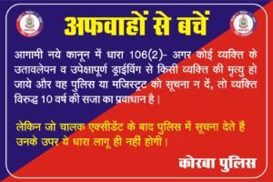 आगामी नये कानून में धारा 106(2) – अगर कोई व्यक्ति के उतावलेपन व उपेक्षापूर्ण कार्य से किसी व्यक्ति की मृत्यु हो जाये। और वह पुलिस या मजिस्ट्रेट को सूचना न दें, तो 10 वर्ष की सजा का प्रावधान है।