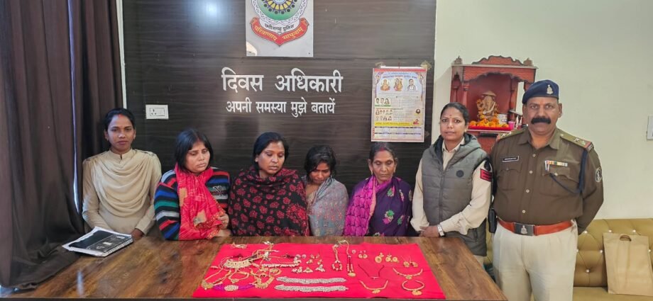 महिलाओं को पकड़ा गया, नाम पता पूछने पर पुलिस को गुमराह करते रहे, जिन्हें चेक करने पर सभी चारो महिलाओ के पास से चोरी गये सोने एवं चांदी के आभूषण जिसमें गले का हार 5 नग, कान के झूमके 5 नग, 2 अंगूठी, पायल 1 नग, सहित कुल किमती लगभग 9 लाख रूपये को जप्त किया गया, सभी महिला आरोपियों को गिरफ्तार कर रिमाण्ड पर न्यायालय मे पेश किया गया।