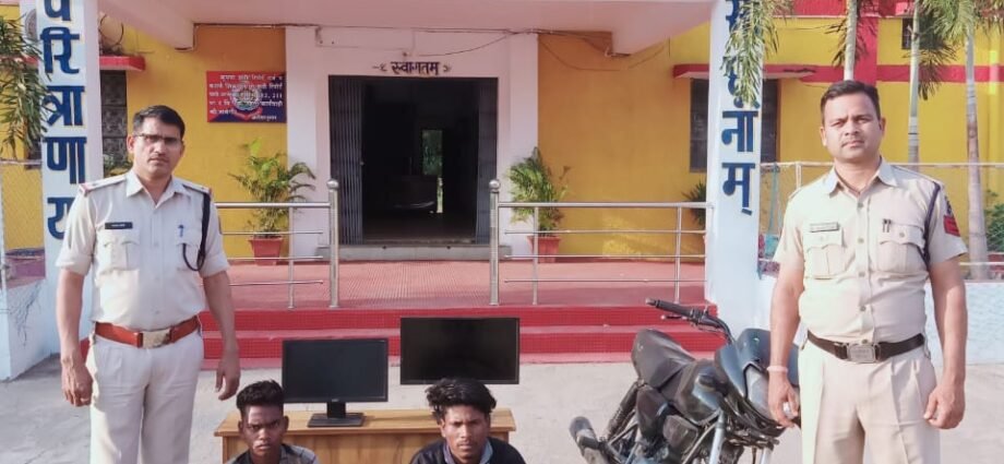पुलिस अधीक्षक कोरबा श्री सिद्धार्थ तिवारी द्वारा अवैध गतिविधियों में संलिप्त रहने वाले एवं विधि विरूद्ध कार्य करने वालों के विरूद्ध सख्त एवं प्रभावी कार्यवाही करने का निर्देष दिया गया जिस पर अतिरिक्त पुलिस अधीक्षक श्री यू.बी.एस. चौहान एवं नेहा वर्मा के पर्यवेक्षण में अवैध गतिविधियों पर कार्यवाही किया जा रहा है। इसी कड़ी में दिनांक 25.02.2024 को प्रार्थी पंचराम पिता षिजलाल निवासी डिप्सीपारा नुनेरा थाना पाली जिला- कोरबा द्वारा थाना उपस्थित आकर लिखित षिकायत दिया गया शाम 06.30 बजे डूमरकछार बाजार गया था, अपने मोटरसायकल क्र. सीजी 12 एएल 6968 को बाजार के पास गोड़वाना कार्यालय के सामने खडा किया था जो बाजार करके वापस आने पर मोटरसायकल नहीं मिला, कोई अज्ञात चोर द्वारा चोरी कर ले गया था, कि रिपोर्ट पर पु.स.केन्द्र चैतमा थाना पाली में अज्ञात आरोपी के विरूद्ध अप.क्र. 93/2024 धारा 379 भादवि. पंजीबद्ध कर आरोपी की पतासाजी की जा रही थी कि मुखबीर सूचना मिली कि गोपालपुर चैतमा के पास एक बिना नम्बर एचएफ डिलक्स मोटरसायकल में विसाहू राम एवं प्रमोद गोड़ नाम का दो व्यक्ति आया है, सूचना पर घेराबंदी कर पूछताछ करने पर अपना नाम विसाहू राम चौहान पिता रामायण सिंह चौहान उम्र 23 वर्ष निवासी पोटापानी गडईहा पारा पुसके. चैतमा थाना पाली एवं दुसरा व्यक्ति ने अपना नाम प्रमोद गोड़ पिता गोविंद सिंह गोड़ उम्र 20 वर्ष निवासी ग्राम लाद चौकी कोरबी थाना पसान जिला-कोरबा होना बताया। दोनों आरोपी द्वारा दिनांक 17-18.12.2023 की दरम्यानी रात्रि को ग्राम कांजीपानी स्थित पंजाब एण्ड सिंध बैक का ताला तोड़कर एसीईआर कंपनी का मानिटर तथा दिनांक 25.02.2024 को डूमरकछार बाजार के पास से मोटरसायकल चोरी करना स्वीकार किया। आरोपी के कब्जे से चोरी किए गये एक नग एसीईआर कंपनी का मानिटर एवं मोटरसायकल को बरामद किया गया तथा आरोपी को विधिवत प्रकरण में गिरफ्तार कर न्यायिक रिमाण्ड पर भेजा गया है। पूर्व में ग्राम कांजीपानी स्थित पंजाब एण्ड सिंध बैंक में हुए चोरी की घटना के संबंध में प्रार्थी संतोष एक्का की रिपोर्ट पर दिनांक अप.क्र. 490/2023 धारा 457, 380 भादवि. कायम कर अज्ञात आरोपी की पतासाजी की जा रही थी जो आज दोनों अपराध में आरोपियों को गिरफ्तार करने में पुलिस को सफलता प्राप्त हुई है।