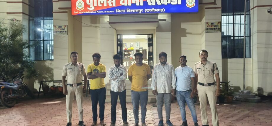 बिलासपुर!दिनांक 13/03/24 को मीडिया पोर्टल्स एवं सोशल मीडिया के माध्यम से यह बात  आयी कि कुछ युवकों द्वारा क्रिकेट मैच में लाइव दांव लगाकर सट्टा खेला और खेलाया जा रहा है। इस सूचना पर पुलिस अधीक्षक महोदय श्री रजनेश सिंह (भापुसे) के निर्देश पर तथा अतिरिक्त पुलिस अधीक्षक (शहर) श्री उमेश कश्यप तथा नगर पुलिस अधीक्षक (कोतवाली) श्रीमती पूजा कुमार के मार्गदर्शन में टीम गठित कर दर्शकों के बीच जाकर सूचना की तस्दीक की। सूचना की पुष्टि होने पर क्रिकेट में सट्टे का दांव लगा रहे 5 युवकों को धर दबोचा। युवकों के कब्जे से 11,100 रुपए नगद, 1 सट्टा पट्टी और 1 डॉट पेन बरामद किया गया। पांचों युवकों के विरुद्ध छत्तीसगढ़ जुआ (प्रतिषेध) अधिनियम, 2022 की संगत धाराओं में अपराध पंजीबद्ध कर पाँचो आरोपियों को माननीय न्यायालय के समक्ष न्यायिक रिमांड हेतु पेश किया गया हैं