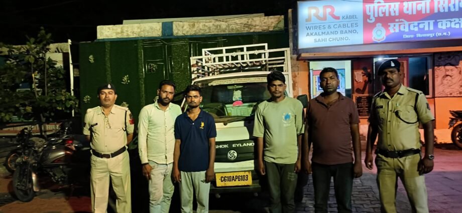 मामले का संक्षिप्त विवरण इस प्रकार है कि प्रार्थी अख्तर हुसैन पिता मरहूम हुसैन उम्र 42 वर्ष निवासी शिवम मोटर्स प्राइवेट लिमिटेड सिरगिट्टी थाना सिरगिट्टी जिला बिलासपुर द्वारा थाना उपस्थित आकर रिपोर्ट दर्ज कराया कि दिनांक 28.04.2024 से 12.05.2024 के मध्य शिवम मोटर्स प्राइवेट लिमिटेड कंपनी सेक्टर सी-4 औद्योगिक क्षेत्र सिरगिट्टी से 11 नग एलडी अपोलो टायर कीमती जुमला 330000 रूपये को किसी अज्ञात व्यक्ति द्वारा चोरी कर ले गया है जिस पर अपराध पंजीबध्द कर थाना प्रभारी सिरगिट्टी द्वारा पुलिस अधीक्षक महोदय बिलासपुर श्री रजनेश सिंह को हालात से अवगत कराकर अतिरिक्त पुलिस अधीक्षक (शहर) श्री उमेश कश्यप एवं नगर पुलिस अधीक्षक (सिविल लाईन) श्री उमेश प्रसाद गुप्ता से दिशा निर्देश पर सिविल टीम गठित कर पूर्व चोरी के प्रकरण मे गिरफ्तार आरोपियों व संदेहियो से पूछताछ किया जा रहा था इसी क्रम मे मुखबीर से सूचना मिला कि अनिल कुमार सोनवानी नाम का व्यक्ति टायर बेचने के लिये ग्राहक ढूॅढ रहा है सूचना पर सिविल टीम द्वारा तस्दीक कर ट्रांसपोर्ट नगर के पास अनिल कुमार सोनवानी को पकडकर थाना लाकर कडाई से पूछताछ करने पर शिवम मोटर्स प्राइवेट लिमिटेड कंपनी के गार्ड अनिरूध्द कुमार साहू व उनके साथी नीतिश कुमार साहू, बबलू रात्रे से टायर खरीदना बताया। आरोपी के निशादेही पर अनिरूध्द कुमार साहू, नीतिश कुमार साहू व बबलू रात्रे को पकडकर थाना लाया गया जिन्होने टायर चोरी करना स्वीकार किये। प्रकरण के आरोपियों से चोरी मे प्रयुक्त वाहन अशोक लिलैण्ड कंपनी का पिकप क्रमांक सीजी10एपी 6103 तथा चोरी हुये 11 नग टायर जप्त कर आरोपियों को विधिवत् गिरफ्तार किया गया।