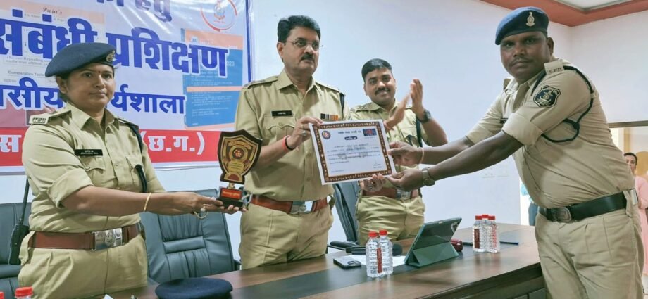 दिनांक 30/07/24 को पुलिस लाइन जिला बिलासपुर स्थित मीटिंग हॉल में ज़िले के वरिष्ठ आरक्षकों हेतु आयोजित प्रशिक्षण कार्यक्रम में जिला पुलिस अधीक्षक बिलासपुर श्री रजनेश सिंह द्वारा उपस्थित सभी वरिष्ठ आरक्षकों को नए क़ानून संबंधित जानकारी दी गई। साथ ही अच्छी पुलिसिंग, उत्कृष्ट विवेचना, मानवीय कार्य करने वाले एवं आम जानता की सहायता करने वालों को पुरस्कृत करने की घोषणा की। इसी कड़ी में पुलिस अधीक्षक द्वारा रतनपुर डॉयल-112 के आरक्षक 1328 बसंत दास मानिकपुरी को बाढ़ में फँसे लोगों को अपनी मानवीयता का परिचय देते हुए नन्हे बच्चे समेत सभी सदस्यों को सुरक्षित बाहर निकालने के लिए उनके अनुकरणीय कार्य के लिए प्रशस्ति पत्र और स्मृति चिह्न देकर सम्मानित किया।