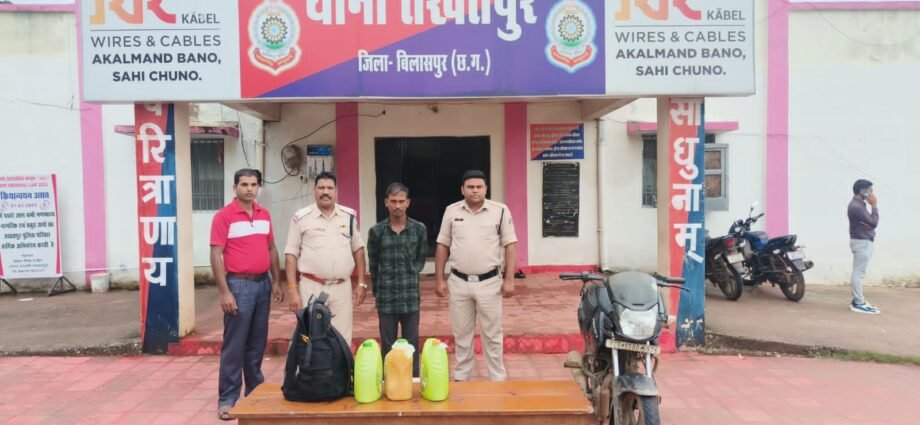 पुलिस अधीक्षक महोदय बिलासपुर श्री रजनेश सिंह (भापुसे) के द्वारा जिले में नशे, अवैध कारोबार करने वालो पर अंकुश लगाने विशेष अभियान प्रहार चलाकर कार्यवाही करने एवं थाना क्षेत्रांतर्गत निशीले पदार्थों का अवैध बिक्री व परिवहन करने वालों के विरूध्द अधिक से अधिक कार्यवाही करने के लिए निर्देशित किया गया है जिसके परिपालन में अवैध शराब बिक्री/परिवहन करने वालो के उपर सतत् निगाह रखी जा रही है। दिनाँक 27-05-2024 को जरिये मुखबीर से सूचना मिला कि ग्राम गनियारी का केशव वर्मा भारी मात्रा बिक्री हेतु अपनी मोटर सायकल क्रमांक CG 10 BD 5976 मे पीछे पीठू बैंग मे ग्राम गनियारी से ग्राम राजपूर के मार्ग मे निकला है जिसकी सूचना तत्काल श्रीमान पुलिस अधीक्षक महोदय रजनेश सिंह (भापुसे) को देकर अतिरिक्त पुलिस अधीक्षक महोदया (ग्रामीण) श्रीमती अर्चना झा एवं श्रीमान अनुविभागीय अधिकारी (पुलिस) कोटा श्रीमति नूपूर उपाध्याय के मार्गदर्शन में थाना प्रभारी देवेश सिंह राठौर के नेतृत्व में कर मय पेट्रोलिंग वाहन के ग्राम राजपूर तस्दीक कार्यवाही हेतु रवाना हुए मौके पर पहुचकर घेराबंदी कर संदेह मोटर सायकल को रोकर रेड कार्यवाही कर 01 व्यक्ति को पकडा तथा मौके पर पूछताछ तलासी पर अपना अपना नाम केशव वर्मा पिता स्व गुलेश राम वर्मा उम्र 25 साल साकिन गनियारी थाना कोटा जिला बिलासपुर छ0ग0 का रहने वाले बताया तथा उसके कब्जे से एक पीठूल बैग के अंदर रखा 03 नग 05-05 लीटर की क्षमता वाली जेरिकेन मे भरा 15 लीटर महुआ शराब एवं घटना में प्रयुक्त 1 मोसा को जप्त कर आरोपी के विरूद्ध धारा 34(2) 59 (क) आबकारी एक्ट के तहत कार्यवाही किया जाकर आरोपी को ज्युडिशियल रिमाण्ड पर भेजा जाता है।