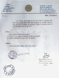 भारतीय जनता पार्टी के सूचना के अधिकार प्रकोष्ठ के जिला संयोजक संतोष राय ने पत्र के माध्यम से जिला कलेक्टर को पटवारी गोविंद सिंह कंवर द्वारा जमीन दलालों के साथ मिलकर किए गए कटु रचना के बारे में जिला कलेक्टर को अवगत कराया है.
