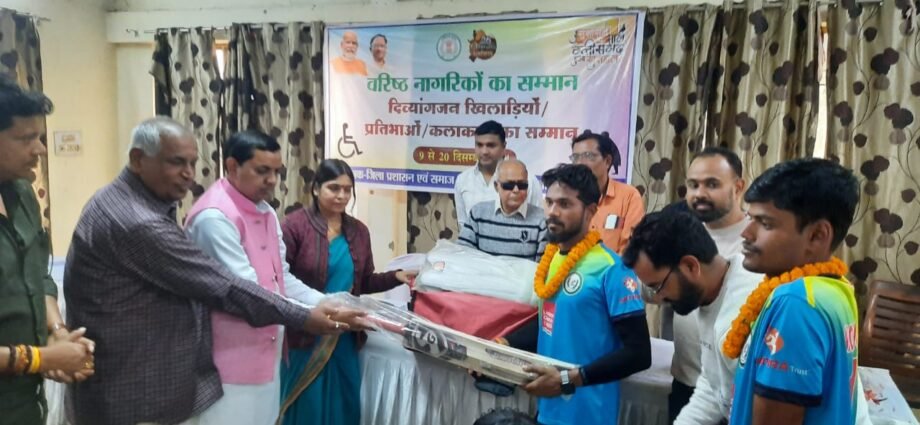 इस अवसर पर राष्ट्रीय क्रिकेट प्रतिस्पर्धा में द्वितीय स्थान आने पर 16 दिव्यांग खिलाड़ियों को बधाई एवं खेल भावना को प्रोत्साहित करने जिला प्रशासन द्वारा क्रिकेट किट एवं लोवर, टी-शर्ट इत्यादि का वितरण किया गया। वरिष्ठ नागरिकों का सम्मान करते हुए उन्हें ऑफिस/ब्रिफिंग बैग प्रदान किया गया। साथ ही सियान सदन में म्यूजिक सिस्टम भेंट किया गया। इस दौरान पार्षद श्री नरेंद्र देवांगन, उप संचालक समाज कल्याण विभाग श्रीमती सिनीवाली गोयल सहित अन्य अधिकारी कर्मचारी उपस्थित थे।