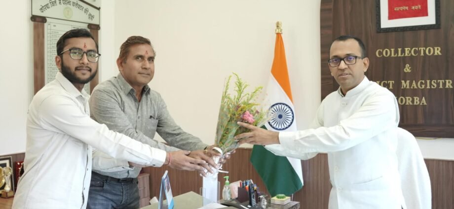 कटघोरा निवासी आकाश अग्रवाल और उनके पिता श्री संतोष अग्रवाल ने आज कलेक्टर श्री वसंत से मुलाकात की। कलेक्टर ने आकाश से विकसित भारत यंग लीडर डायलॉग 2025“ के संबंध में चर्चा करते हुए उनकी प्रतिभा की सराहना की और नई दिल्ली में प्रधानमंत्री के समक्ष कोरबा जिले के युवा द्वारा विजन प्रस्तुत करने के अवसर को सौभाग्यशाली बताया। प्रतियोगिता में चयनित आकाश ने कलेक्टर को बताया कि विकसित भारत यंग लीडर डायलॉग कार्यक्रम के अंतर्गत विकसित भारत क्विज में उत्तीर्ण होने के बाद प्रतिभागियों द्वारा विकसित भारत चैलेंज के 10 विषयों में से किसी एक विषय पर निबंध लिखा गया। निबंधों को मूल्यांकन के किए जाने के उपरांत प्रत्येक विषय में अधिकतम 25 प्रतिभागियों का चयन राज्य चैंपियनशिप के लिए किया गया। राज्य स्तरीय चैंपियनशिप में प्रतिभागियों द्वारा अपने संबंधित निबंध के विषय के आधार पर राजधानी रायपुर में पीपीटी का प्रदर्शन किया गया। पीपीटी के मूल्यांकन अनुसार कोरबा के आकाश अग्रवाल का राष्ट्रीय युवा उत्सव दिल्ली में भाग लेने हेतु चयनित किया गया है।