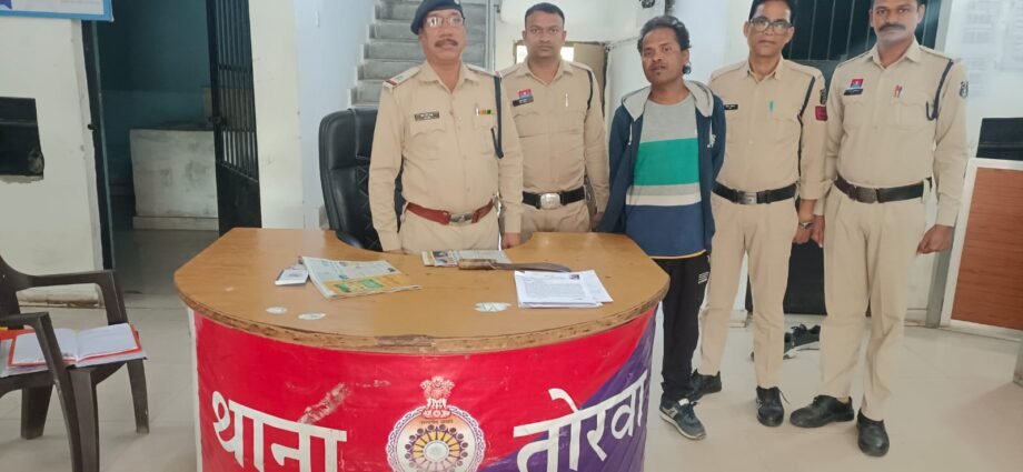 मामले का संक्षिप्त विवरण इस प्रकार है कि श्रीमान् पुलिस अधीक्षक महोदय श्री रजनेश सिंह(भापुसे) द्वारा त्रिस्तरीय पंचायत एवं नगरीय निकाय चुनाव के मद्देनजर जिले में अशांति फैलाने वाले बदमाशों के विरूद्ध वैधानिक कार्यवाही करने हेतु निर्देशित किया गया है, जिसके पालन में क्षेत्र में लगातार पेट्रोलिंग की जा रही है। कि दिनांक 08.02.2025 को थाना तोरवा को सूचना प्राप्त हुई हेमुनगर मुर्राभट्टा गली में नवीन कांति उर्फ पापा नामक व्यक्ति लोहे का खुखरी (चाकू) लेकर आमजनों को डरा धमका रहा है कि सूचना मिलने पर अतिरिक्त पुलिस अधीक्षक महोदय शहर बिलासपुर श्री राजेंद्र जायसवाल एवं सी.एस.पी. (कोतवाली) श्री अक्षय प्रमोद सबद्रा (भापुसे )को अवगत कराया जाकर उनके मार्ग दर्शन एवं प्रभारी निरी. अभय सिंह बैस के नेतृत्व में टीम द्वारा घेराबंदी कर मुर्रा भट्टा गली से आरोपी नवीन कांति उर्फ पापा को पकड़ा गया। जिसके कब्जे से लोहे का खुखरी (चाकू) जप्त कर आर्म्स एक्ट के प्रावधानों के तहत् कार्यवाही कर न्यायिक रिमाण्ड पर भेजा गया है।