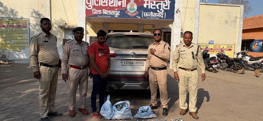 मामले का संक्षिप्त विवरण इस प्रकार है कि पुलिस अधीक्षक महोदय बिलासपुर श्री रजनेश सिंह (भा.पु.से.) द्वारा जिले में नशे के अवैध कारोबार पर अंकुश लगाने हेतु अधिक से अधिक कार्यवाही करने निर्देशित किया गया है, जिसके परिपालन में श्रीमान् अति.पुलिस अधीक्षक महोदय बिलासपुर श्री उदयन बेहार एवं सी.एस.पी. (सरकंडा) श्री सिद्धार्थ बघेल द्वारा जिले में अवैध शराब/गांजा बिक्री करने वालों के विरूद्ध प्रभावी कार्यवाही करने निर्देशित किया गया है। वरिष्ठ अधिकारियों द्वारा दिये गये निर्देश के पालन में थाना प्रभारी मस्तुरी निरी. हरीशचंद्र टांडेकर के मार्गदर्शन में टीम तैयार कर पतासाजी की जा रही थी कि दिनाक 15.02.25 को मुखबीर से सूचना मिला कि एक व्यक्ति एक एम जी हेक्टर कार क्रमांक सीजी 10 बी एफ 8055 में भारी मात्रा में अवैध शराब लेकर बिलासपुर से हिर्री की ओर जा रहा है उक्त सूचना तस्दीक हेतु तत्काल टीम द्वारा रेड कार्यवाही कर अजय साहू को अवैध देशी प्लेन शराब परिवहन करते हुये पकड़ा गया जिसके कब्जे से 142 पाव (25.560 लिटर) अवैध देशी शराब किमती 12780 रू.एव एक सफेद रंग एम जी हेक्टर कार बरामद कर आबकारी एक्ट के प्रावधानों के तहत् कार्यवाही किया गया है।