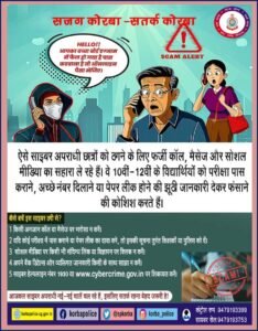 कोरबा पुलिस आमजन, विशेषकर 10वीं एवं 12वीं कक्षा के विद्यार्थियों एवं उनके पालकों से अपील करती है कि वे ‘परीक्षा में पास कराने’ या ‘अंक बढ़वाने’ के नाम पर आने वाले किसी भी अज्ञात कॉल, मैसेज या ईमेल से सावधान रहें। हाल ही में यह देखा गया है कि परीक्षा परिणाम की प्रतीक्षा में मानसिक तनाव से जूझ रहे छात्रों एवं उनके पालकों को निशाना बनाकर कुछ साइबर अपराधी खुद को शिक्षा बोर्ड या स्कूल प्रबंधन का अधिकारी बताकर ठगी का प्रयास कर रहे हैं।