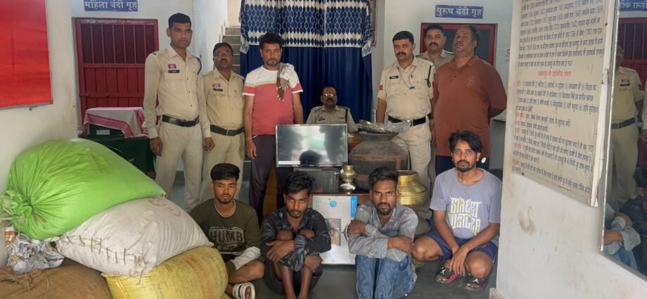 ग्राम अकलतरी निवासी प्रार्थी गजानंद शर्मा व साश्वत शर्मा के सुने मकान में दिनाँक 03-04/01/2025 की दरमियानी रात अज्ञात चोरों ने घर का ताला तोड़कर घर से धान, गेहॅू, काँसे का बर्तन, चॉदी का एक जोड़ी पायल, एलईडी टी.व्ही., कम्प्यूटर सेट चोरी कर लिया था। जिसकी रिपोर्ट पर थाना रतनपुर में चोरी का अपराध पंजीबद्ध कर जाँच व अज्ञात चोरों की लगातार पतासाजी की जा रही थी। अज्ञात आरोपी चोर के बारे पतासाजी हेतु मुखबीर लगाया गया था। जरिये मुखबीर से सूचना मिला कि ग्राम अकलतरी राजकमल धीवर के घर में चोरी का कुछ सामान रखा हुआ है कि सूचना पर संदेही को अभिरक्षा में लेकर पुछताछ करने पर ग्राम अकलतरी के दो सुने मकानों में अपने अन्य साथी के साथ जीतू धीवर, अकबर खान के साथ चोरी करना स्वीकार किया। चोरी किये बर्तन व धान, गेहॅू को कोनी बिलासपुर में बेचना बताने से चोरी करने वाले व चोरी के सामान खरीदी करने वाले व्यापारियों के विरूद्ध पर्याप्त सबूत पाये जाने से 06 आरोपियों को गिरफ्तार कर न्यायिक रिमाण्ड पर भेजा गया।