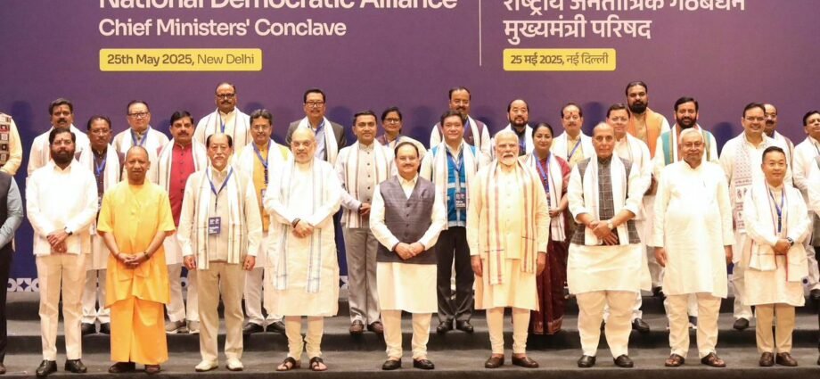रायपुर 25 मई 2025/ राजधानी दिल्ली स्थित अशोक होटल में आयोजित मुख्यमंत्री परिषद की बैठक में छत्तीसगढ़ सरकार के सुशासन मॉडल, नवाचारों और जनभागीदारी आधारित योजनाओं ने विशेष पहचान बनाई। मुख्यमंत्री श्री विष्णु देव साय द्वारा प्रस्तुत बस्तर ओलंपिक और बस्तर पंडुम जैसे अभिनव आयोजनों ने प्रधानमंत्री श्री नरेंद्र मोदी सहित विभिन्न राज्यों के मुख्यमंत्रियों का ध्यान आकर्षित किया। बैठक में उपमुख्यमंत्री श्री अरुण साव एवं श्री विजय शर्मा भी उपस्थित थे।