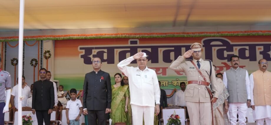 कोरबा में स्वतंत्रता दिवस मुख्य समारोह में मुख्य अतिथि मंत्री श्री लखनलाल देवांगन ने हजारों नागरिकों की उपस्थिति में प्रातः 9 बजे ध्वजारोहण किया और परेड की सलामी ली। इस अवसर पर राष्ट्रगान प्रस्तुत किया गया। सुरक्षा बलों द्वारा हर्ष फायर किया गया और छत्तीसगढ़ सशस्त्र बल, सीआइ्र्रएसएफ, जिला पुलिस बल, सुरक्षा बल,नगर सेना, वन रक्षक, स्काउट गाइड सीनियर-जूनियर डिवीजनों द्वारा आकर्षक मार्च पास्ट प्रस्तुत किया गया। परेड कमांडरों द्वारा परेड रिपोर्ट प्रस्तुत की गई। मुख्य अतिथि ने परेड का निरीक्षण किया। इस दौरान उनके साथ कलेक्टर श्री अजीत वसंत एवं पुलिस अधीक्षक श्री सिद्धार्थ तिवारी उपस्थित थे। उन्होंने अनेकता में एकता के प्रतीक गुब्बारे आकाश में छोड़े। इसके बाद विभिन्न शालाओं के छात्र-छात्राओं द्वारा आकर्षक, मनमोहक देशभक्ति गीतों पर आधारित सांस्कृतिक कार्यक्रमों की प्रस्तुति दी गई। जिसका दर्शकों द्वारा करतल ध्वनि से स्वागत किया गया ओर कार्यक्रमों का आनंद लिया। समारोह में अपने कर्तव्य निर्वहन के दौरान शहीद होने वाले जवानों के परिजनों को सम्मानित किया गया।