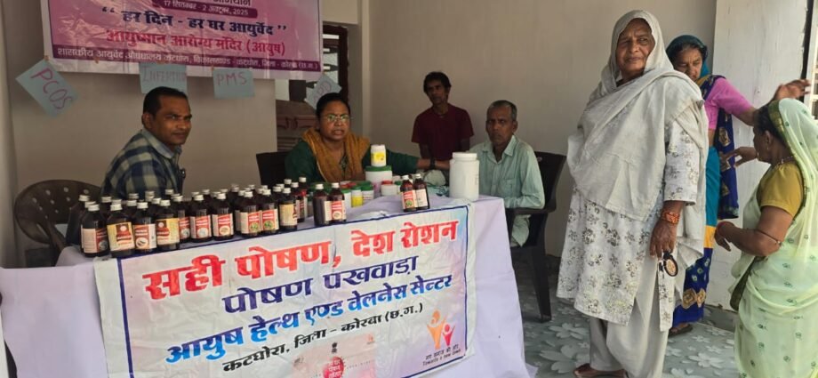 संचालनालय आयुष विभाग रायपुर के निर्देशानुसार और आयुष जिलाधिकारी डॉक्टर उदय शर्मा जी के मार्गदर्शन में आयुष्मान आरोग्य मंदिर कटघोरा द्वारा स्वस्थ नारी सशक्त परिवार अभियान 17 सितंबर से 2 अक्टूबर तक चलाया जा रहा है। जिसमें आज अभियान का आठवां दिवस है इस अभियान के तहत आयुष्मान आरोग्य मंदिर