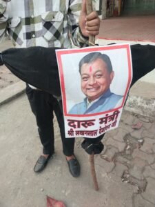 निहारिका एवं टीपी नगर में संचालित अंग्रेजी शराब दुकानों के सामने युवा कांग्रेस नेताओं ने जमकर नारेबाजी की और आबकारी मंत्री का पुतला फूॅंका, पुतले में दारू मंत्री लखन लाल देवांगन लिखा हुआ था। इन दोनों जगह युवा नेताओं ने राष्ट्रपिता महात्मा गांधी की तस्वीर लेकर रघुपति राघव राजाराम पतित पावन सीताराम भजन का गायन करते रहे।