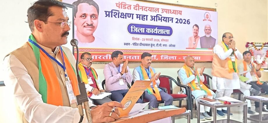 कोरबा। भारतीय जनता पार्टी जिला कोरबा द्वारा पं. दीनदयाल उपाध्याय प्रशिक्षण महाअभियान 2026 की तैयारियों को लेकर जिला स्तरीय प्रशिक्षण कार्यशाला आज भाजपा जिला कार्यालय पंडित दीनदयाल कुंज, की.पी. नगर, कोरबा में भव्य रूप से सम्पन्न हुई। कार्यशाला की अध्यक्षता भाजपा जिलाध्यक्ष श्री गोपाल मोदी जी ने की। कार्यक्रम की शुरुआत ध्वजारोहण के साथ हुई। इसके पश्चात दीप प्रज्ज्वलन, वंदे मातरम् एवं राज्यगीत के सामूहिक गायन के साथ आयोजन का शुभारंभ हुआ। अतिथियों को शाल व स्वदेशी वस्तुओं से बने स्मृति चिन्ह भेंट कर उनका आत्मीय स्वागत-अभिनंदन किया गया।