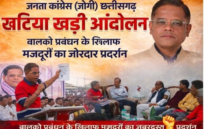 कोरबा, बालको। औद्योगिक क्षेत्र भारत एल्यूमिनियम कंपनी लिमिटेड (BALCO) में स्थानीय मजदूरों और युवाओं के साथ कथित अन्याय के विरोध में शुक्रवार को बड़ा जनआंदोलन देखने को मिला। जनता कांग्रेस छत्तीसगढ़ (जोगी) के नेता Amit Jogi के नेतृत्व में बालको पावर प्लांट के सामने ‘खटिया खड़ी आंदोलन’ आयोजित किया गया। आंदोलन में सैकड़ों की संख्या में पार्टी कार्यकर्ता, स्थानीय मजदूर और क्षेत्रीय नागरिक शामिल हुए और बालको प्रबंधन की नीतियों के खिलाफ जोरदार विरोध दर्ज कराया।