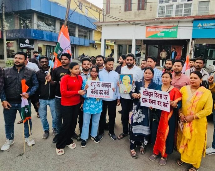 कोरबा छत्तीसगढ़ कोरबा- युवा कांग्रेस के नेतृत्व में युवा कांग्रेस के पदाधिकारी एवं सदस्यों ने राष्ट्रपिता महात्मा गांधी की पुण्यतिथि के दिन 30 जनवरी को देशी एवं अंग्रेजी शराब दुकानों के खुलने का विरोध किया। निहारिका एवं टीपी नगर में संचालित अंग्रेजी शराब दुकानों के सामने युवा कांग्रेस नेताओं नेContinue Reading